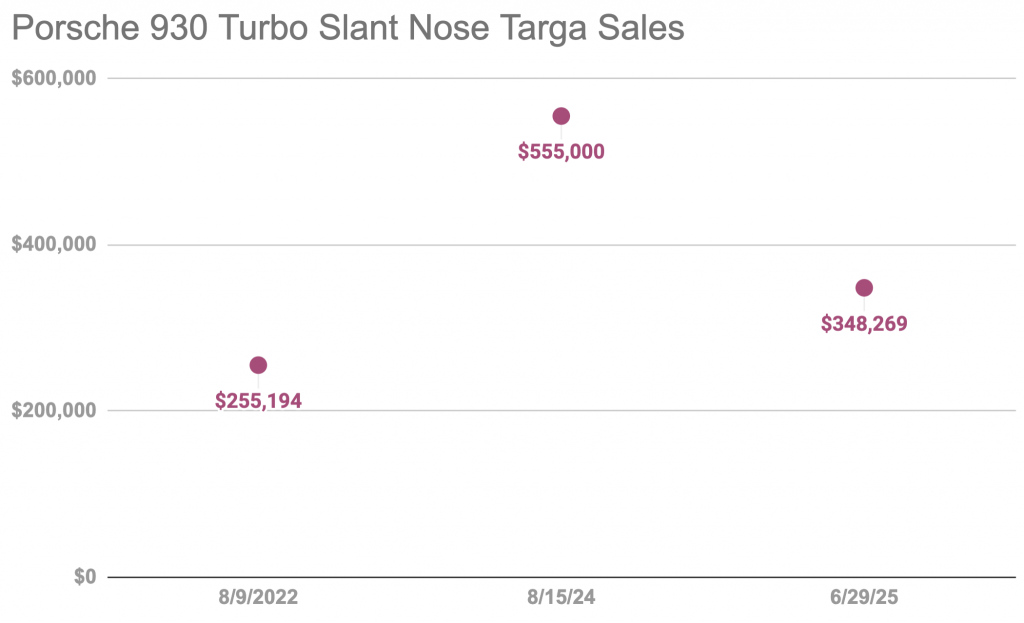 One of the things the data showed — and I was surprised to see — is that the value of Coupes, Targas, and Cabriolet variants of 930 Turbo cars does not mirror the trend in the broader 911 market. Coupes represent the lowest value, which is counter to the 911 market as a whole, and Cabriolets are approximately 10% more valuable than Coupes. Based on sales data, Targas are more valuable than Cabriolets, which does jive with the rest of the air-cooled 911 market.