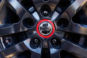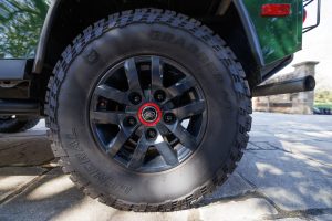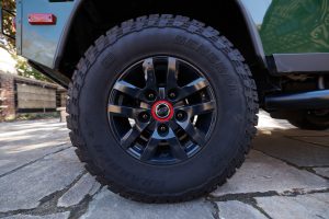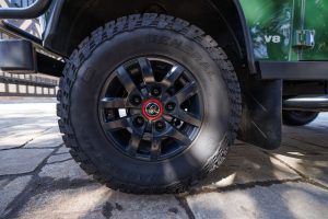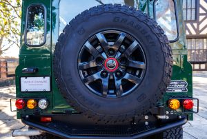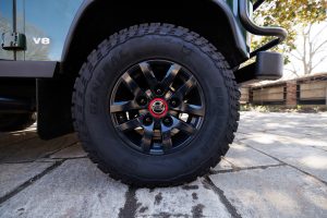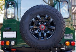 Replacing the original silver 5-spoke alloys are a set of attractive and desirable Kahn 1948 16” wheels in matte black. Surrounding the center cap is an eye-catching red pinstripe. In the event of an on-road or off-road puncture, a matching spare wheel with new tire is mounted to the rear carrier. All five wheels wear General Grabber All Terrain tires in size 265/75 R16 with date codes reading the 17th week of 2019.