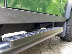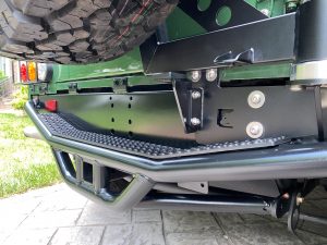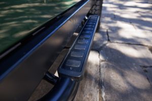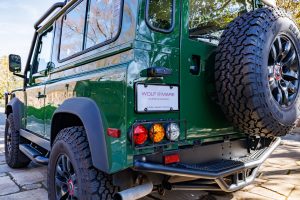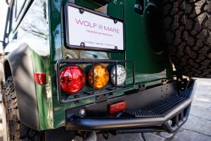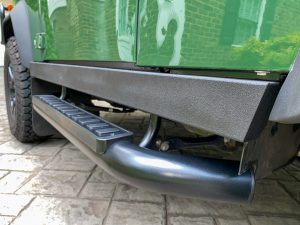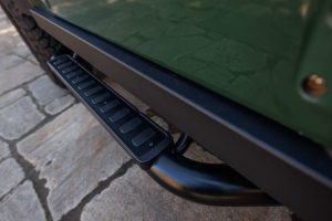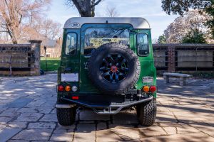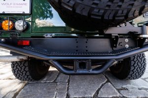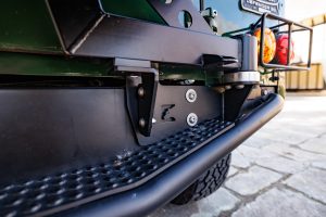 Rock sliders and side steps have been added to provide some off-road protection and ease of entry, respectively. Mounted to the rear cross-member is a Series-Defender Outfitters swing-away rear tire carrier and a step bumper with integrated tow hitch. An LED third brake shines stylishly from behind the spare wheel.