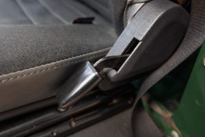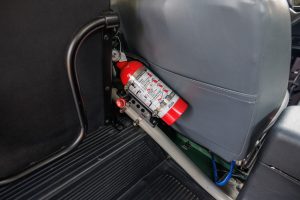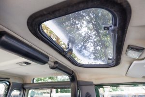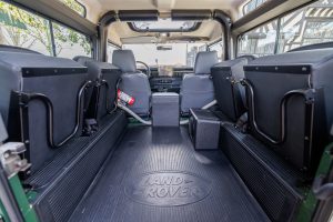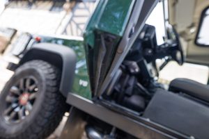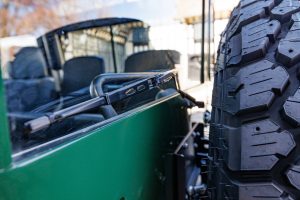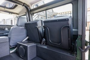 Ventilation is provided by positionable cowl vents, a pop-up sunroof and sliding safari windows in the rear. Four side-facing rear jump seats include seat belts for each occupant and can be folded up to provide more cargo room. A fire extinguisher has been fixed to the roll bar using a custom quick-release mount.