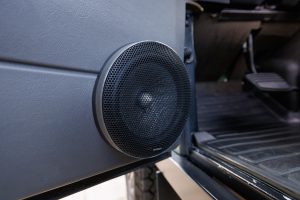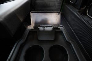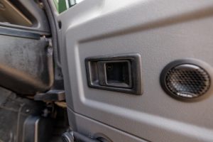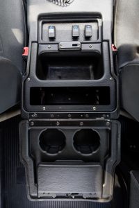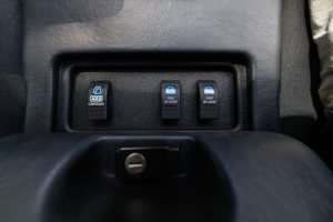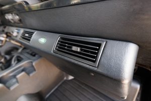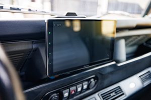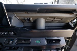 Air conditioning was standard for North American Defenders, and the previous owner of this D90 added even more conveniences including: a Pioneer touchscreen stereo with Apple CarPlay connectivity, integrated rear-view camera, upgraded speakers in the doors, subwoofer in the rear compartment, and seat heater controls. Switchgear for the locking differentials has been mounted in the center console just ahead of the storage compartment.