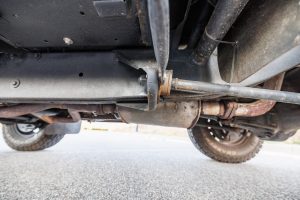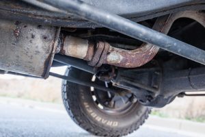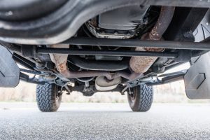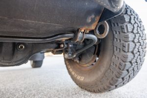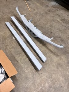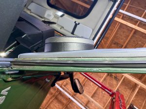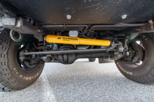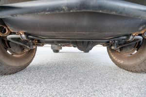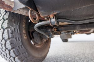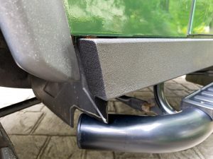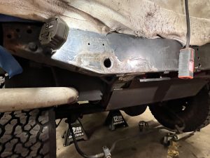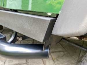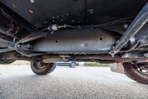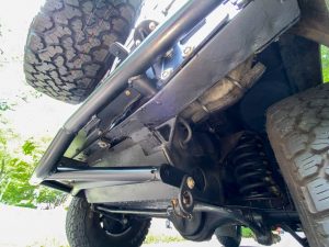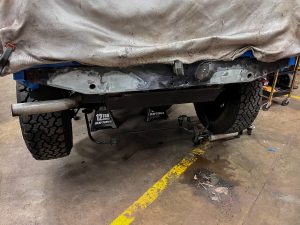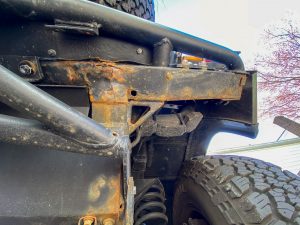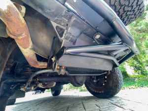 Rusty areas were cut out and replaced with fresh metal and the interior was treated with a rust preventer. Images of the repair work and final result can be seen in the gallery below. The rock rails and rear bumper were similarly stripped and refreshed. The exhaust system shows evidence of heavy surface rust but is solid with no holes or leaks that we can see (or hear).