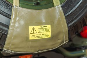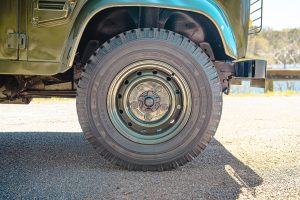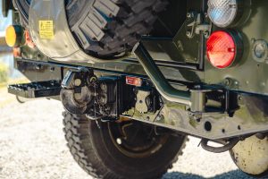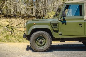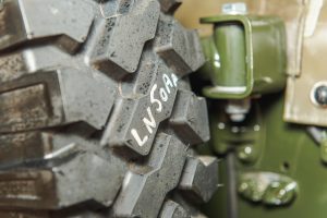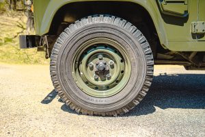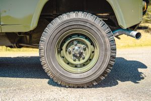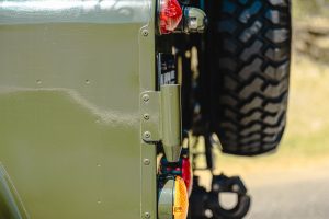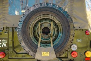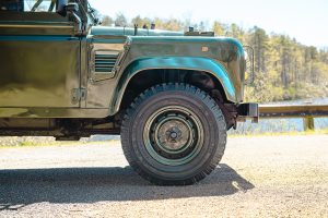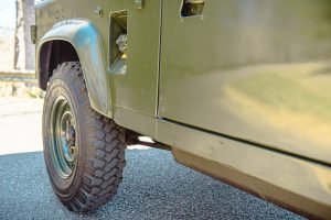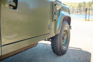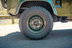 The military spec Heavy Duty steel wheels are fitted with Michelin 4X4 Off Road XZL tires in size 7.50 R16C. In case of puncture, the Land Rover Defender Wolf had provisions for mounting a spare wheel on the bonnet or via side mount on the driver’s side. This Wolf comes with a matching spare wheel and tire mounted on the swing gate.