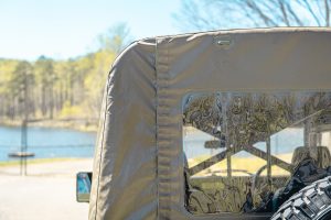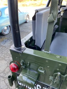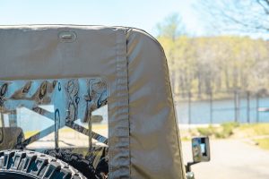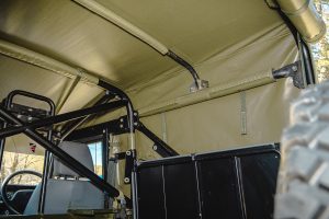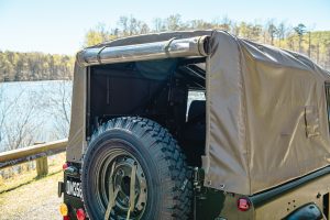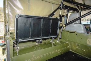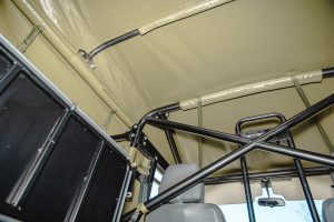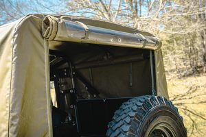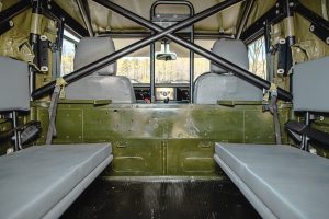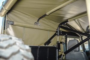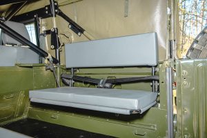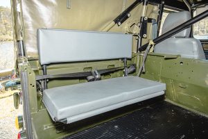 The soft top can be rolled up or completely removed for open-air driving. A spacious rear cargo area features jerry can mounts and interior-facing rear seats that can be flipped up to further increase cargo capacity. Of note are the REMUS installed rear seatbelts, a nice safety feature for passengers.