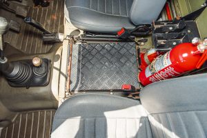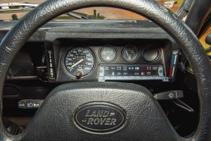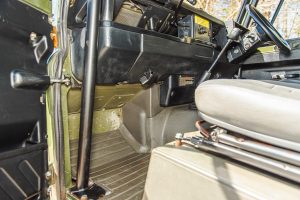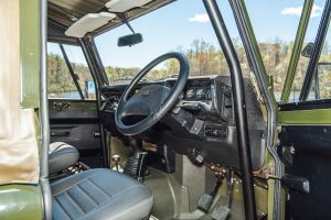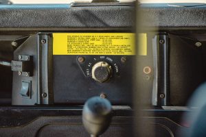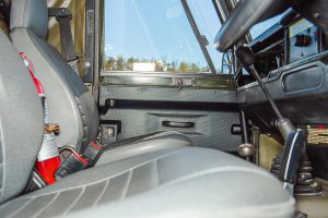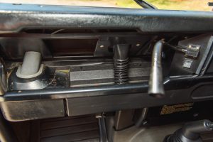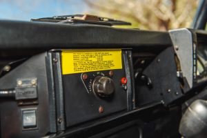 Interior features include lockable sliding passenger and driver’s side windows, ashtray, lighting controls, sun visors, map light and fire extinguisher. Behind the right-hand drive wheel, the gauge cluster includes a kph speedometer, fuel and engine temperature indicators, and warning lights. Flanking the gauge pod are the heating and ventilation controls. This Defender does not have air conditioning, but cowl vents provide supplemental airflow at speed.