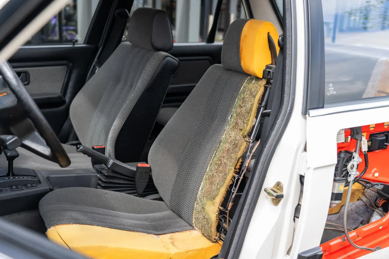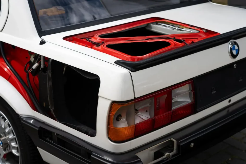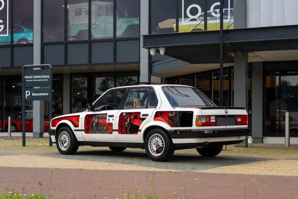 Interestingly, only one half of the car has been cutaway, with the other side presenting as a 100% normal and extraordinarily well-preserved 325i. The commitment to exposing the inner workings of this Bavarian sedan extends to the alloy wheels, sunroof, roof panel, rear quarter, and even the plastic housings for the taillights. The interior metalwork has been painted in a bright orange-red color to further accentuate the mechanics inside.