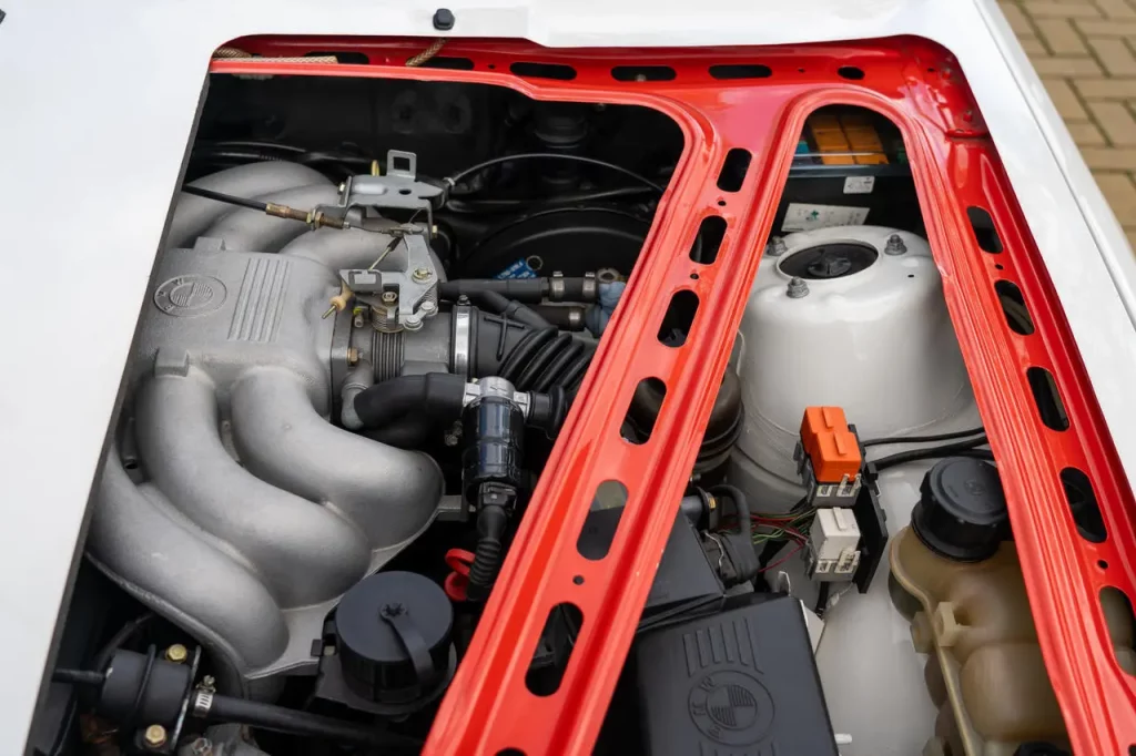 A large cutout panel on the engine compartment lid exposes the hood’s support structure and the M20 inline-six cylinder engine underneath. It’s not clear if any of the underhood components have been cutaway, but it looks as though the operating bits of the car were intentionally kept operational.