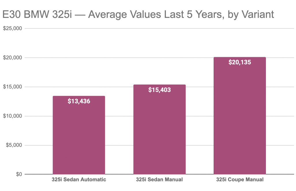 The E30 3-Series BMW has seen impressive appreciation over the last 10 years, mostly driven by the incredible popularity of the box-flared M3 coupe. In general, two-door E30s are more desirable than sedan variants and manual transmission cars bring more money than automatics.