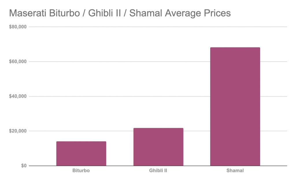 The average price for a Maserati Biturbo, across all years of the platform, is currently $14,000. Like everything, the market peaked in 2022 and has steadily declined since. It should be noted that this average includes all models excluding the Shamal and Ghibli II from 1982 to 1985.