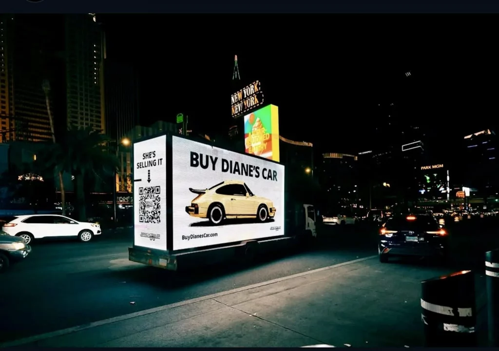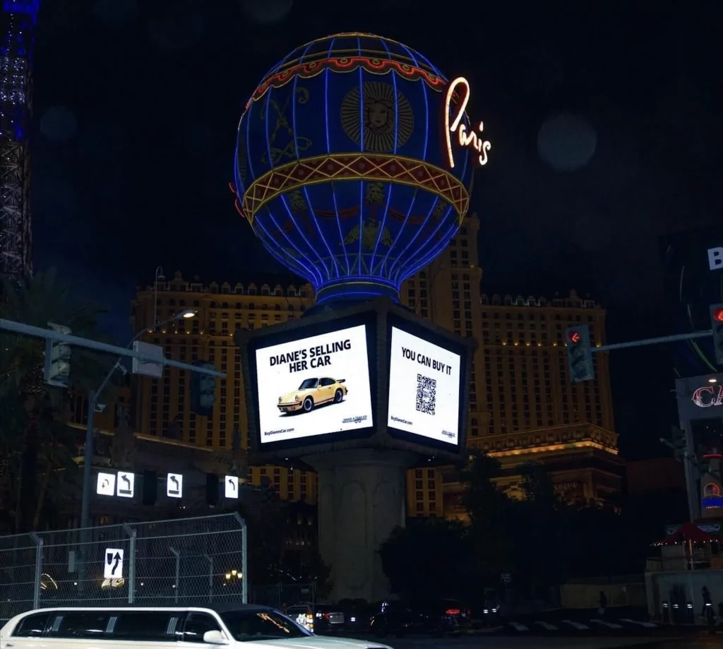 Buy Diane’s Car is clearly a targeted campaign intended to support this overarching strategy. Stickers, flyers, billboards, sign boards, and more with the tag line “Buy Diane’s Car” were used to blanket Las Vegas in advertising in a guerilla-style approach. Featuring a prominent image of a Sahara Beige 1986 Porsche 911 on a plain white background with black text, the ads felt home-grown despite the sizable media spend behind them. The weekend of the Las Vegas Grand Prix was obviously chosen to reach a captive audience of automotive and motorsports enthusiasts.
