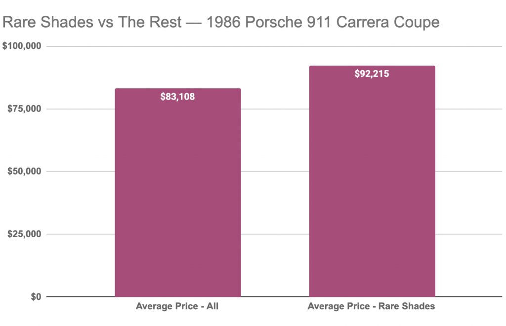 As you can see in the chart above, 1986 Porsche 911 Carreras sold in the last 12 years that were painted in something other than a common color typically sell at a 10% premium. Ultra-rare colors can result in some truly impressive high bids.