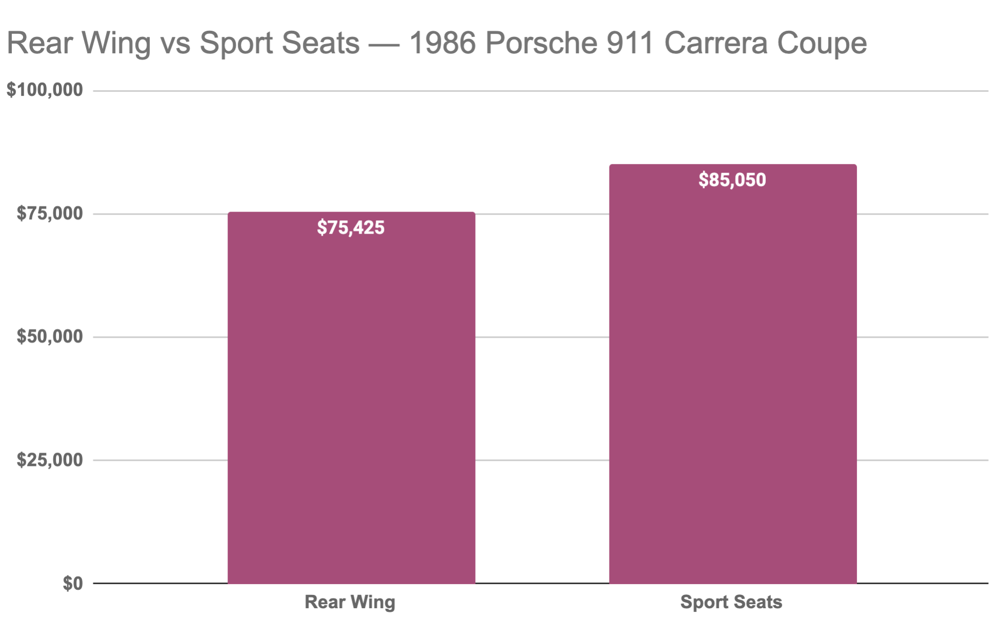 The size of my data set — which covers base (non-M491 or Turbo) 1986 Porsche 911 Carrera Coupes sold in the last 12 months — limits concrete conclusions, but Sport Seats appear to be a desirable option on G-body 911s. This seems like common sense. Surprising, maybe, is that a rear wing neither adds nor hurts value.