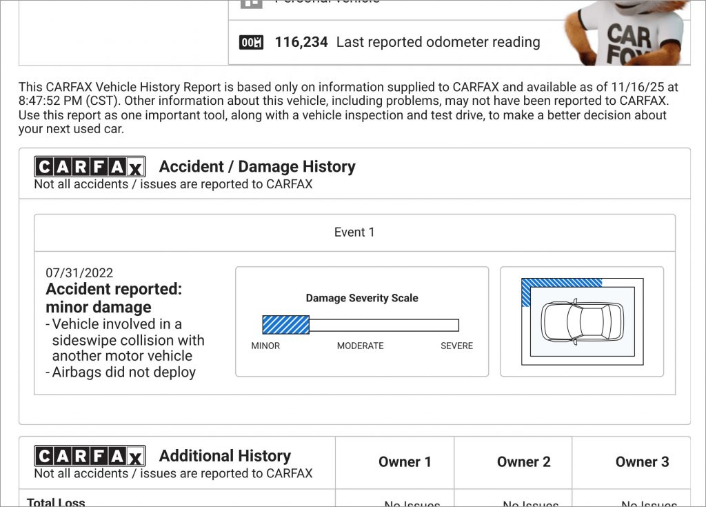 Buyers have consistently shown that they are willing to pay more for a vehicle with a clean history report. A “clean” history is one that’s absent of accidents. Value differentials can range from 10% to 20% or more in some cases.