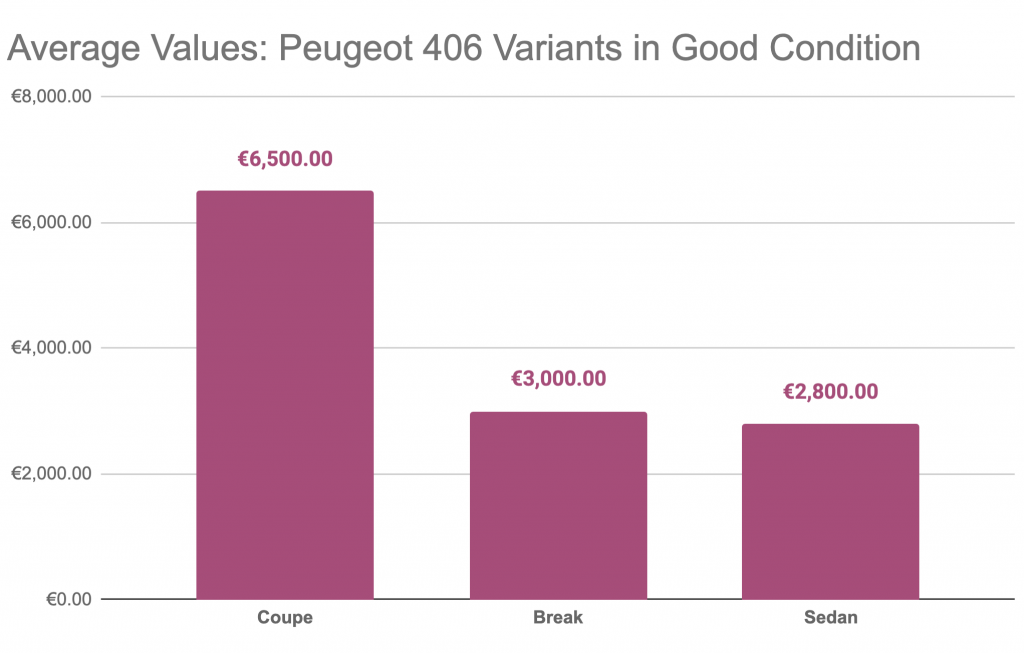 As you can see in the chart above, the Coupé version commands the highest top-end retail prices, followed by the station wagon version which brings 10-15% over the sedan. Today’s car is priced at €7,950, which is more than double the average high retail price for a 1.8L Peugeot 406. That said, it’s one of the cleanest examples of this popular and ubiquitous French sedan you’re likely to find.