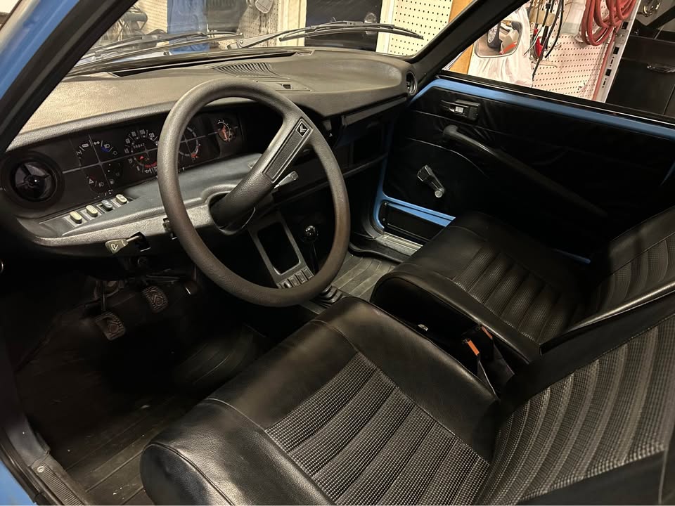 The interior is upholstered in black vinyl with basketweave center inserts. A trademark single-spoke steering wheel dominates the interior, which appears remarkably modern. The dash looks almost like something out of a late-model BMW. Sadly, this dashboard doesn’t feature the super-cool “bathroom scale” style speedometer of the Citroën GS on Bring A Trailer.