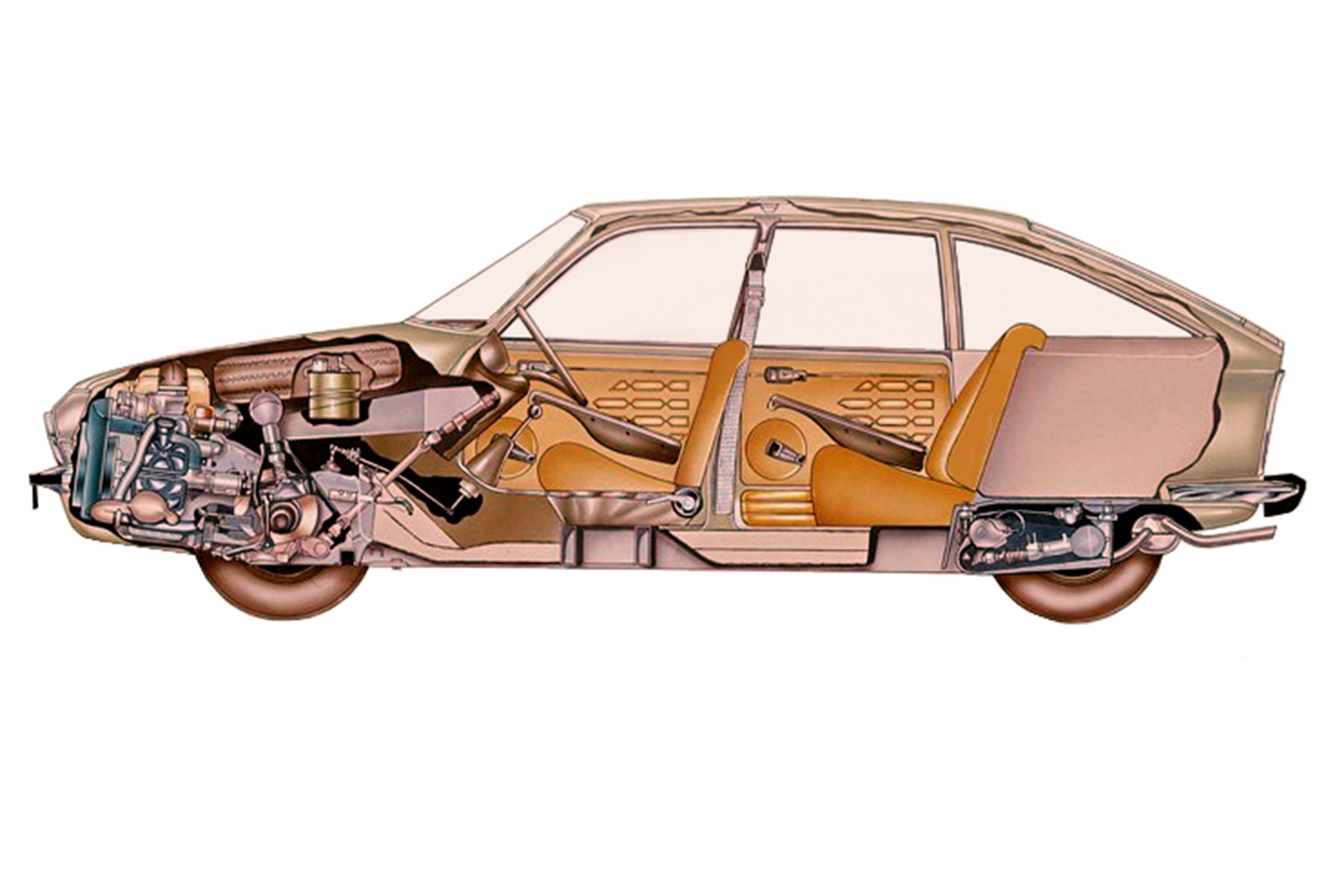 From the outset the GS distinguished itself with advanced technical specification for its class: independent four-wheel suspension combining double wishbones at the front and trailing arms at the rear, hydropneumatic self-levelling suspension, in-board front disc brakes integrated into a central hydraulic system (derived from the DS) and a remarkably aerodynamic body shell boasting a drag coefficient around 0.318.
