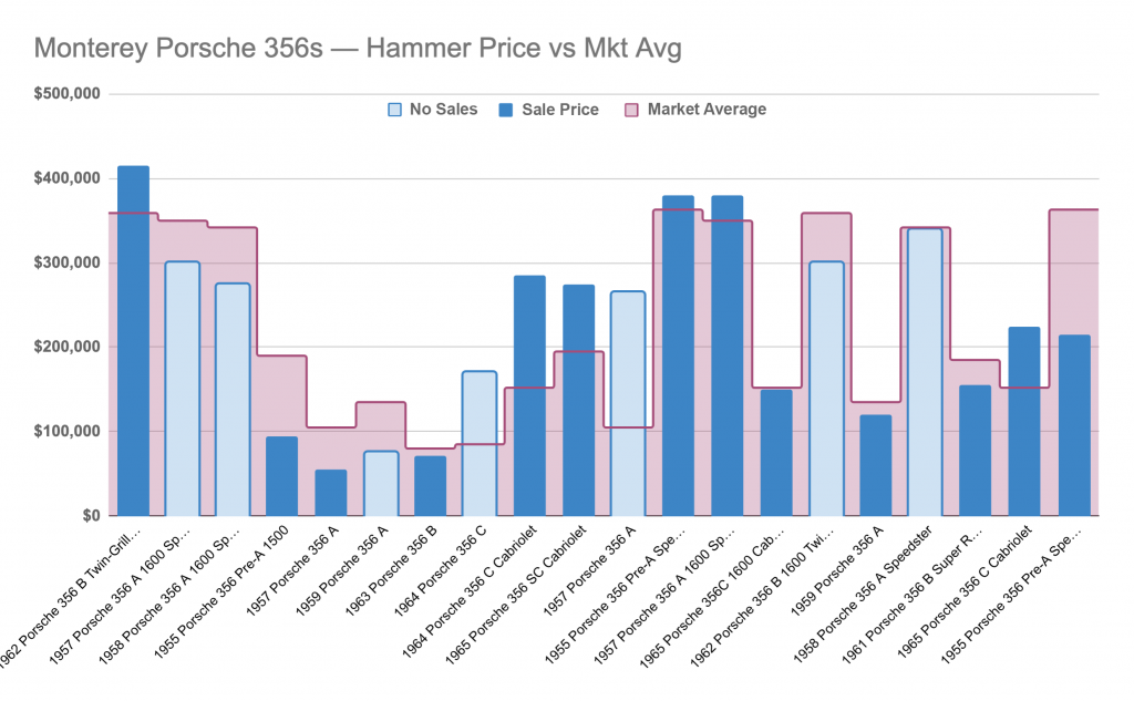 Instead of comparing the bid or sale price against the house estimates, I chose to use market value (based on completed sales) instead. Since auction estimates are part valuation and part marketing, they are not reliable indicators of value. The chart below visualizes results for the 20 “standard” cars and includes no-sales as well as completed sales. The light burgundy color reflects market value for that 356 type. The 4 special Porsche 356s were excluded as fewer comps exist.
