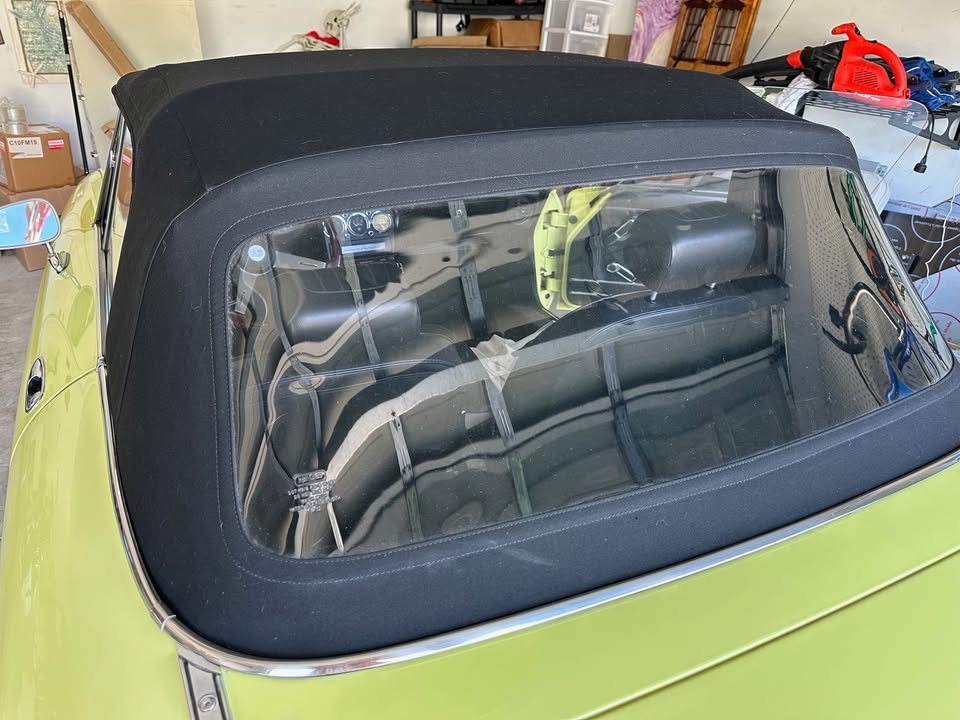 The reasonably spacious trunk includes factory tools and a boot cover for the soft top when it is retracted. A new soft top fits very nicely and the plastic rear window is in excellent condition.