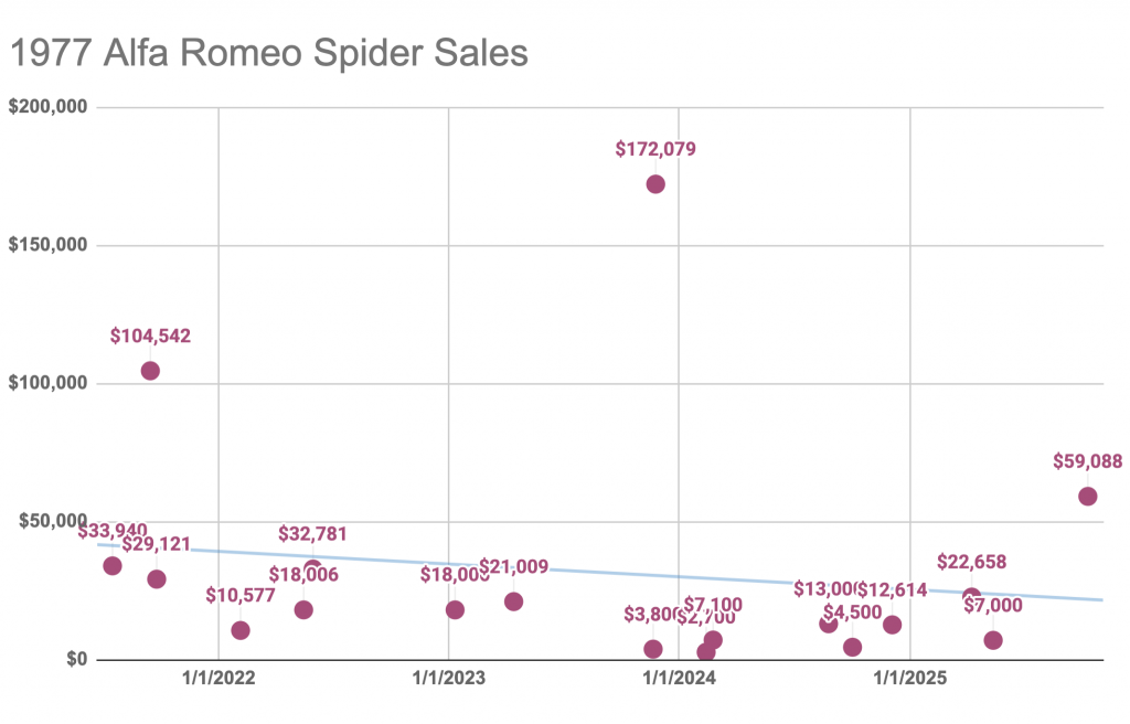 Looking at Classic.com values, you’ll see an average price of $31,000 for a 1977 Alfa Romeo Spider. This is a great example of where averages can be very misleading. Two exceptional cars, one of which sold for over $100,000, have significantly inflated the average.