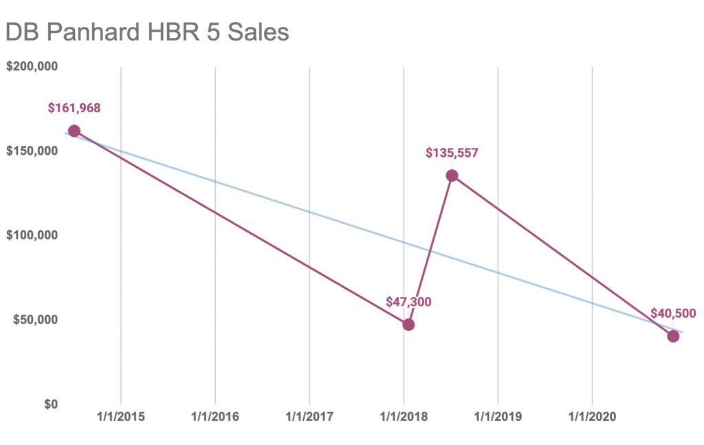There are 12 sales comps for DB cars dating back to 2014. These seem to be cars that are generally sold through private or retail transactions. Those sales include some of the rarer competition cars and not just HBR5 coupes. Five total sales for these cars are available, and I’ve displayed them in the graph below.