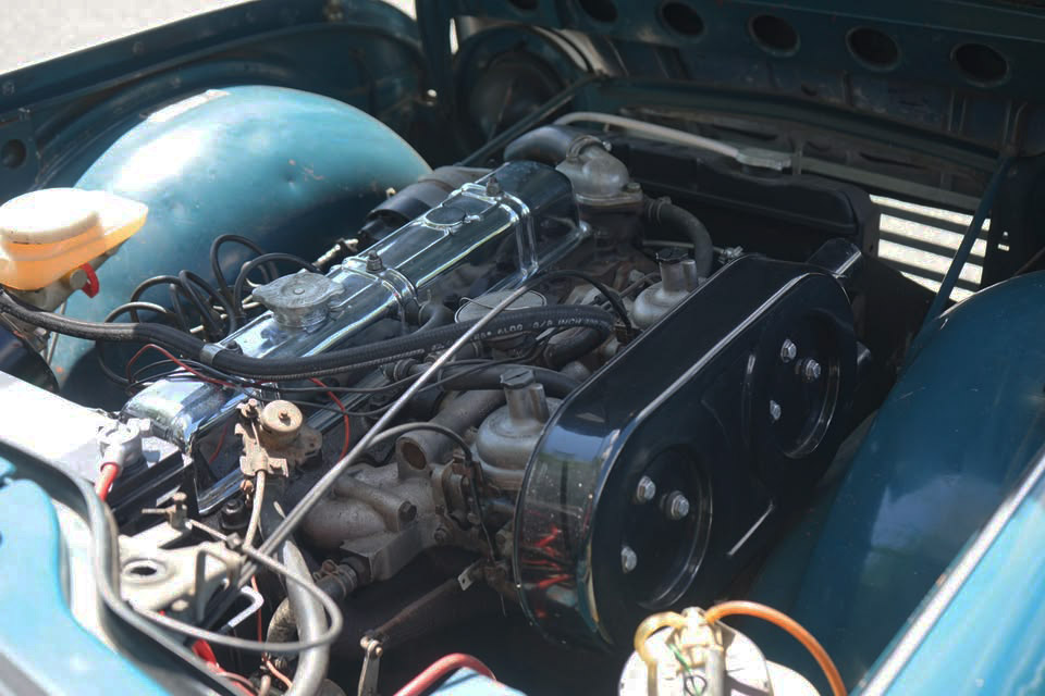 Underhood the 6-cylinder engine looks pretty tidy, with good condition of the finishes and no obvious leaks from the Stromberg carbs. There’s some patina, obviously, but I’ve seen much dirtier. The brake fluid reservoir looks to have clear and clean fluid in it indicating recent maintenance. A new stainless steel exhaust is noted as having been fitted.
