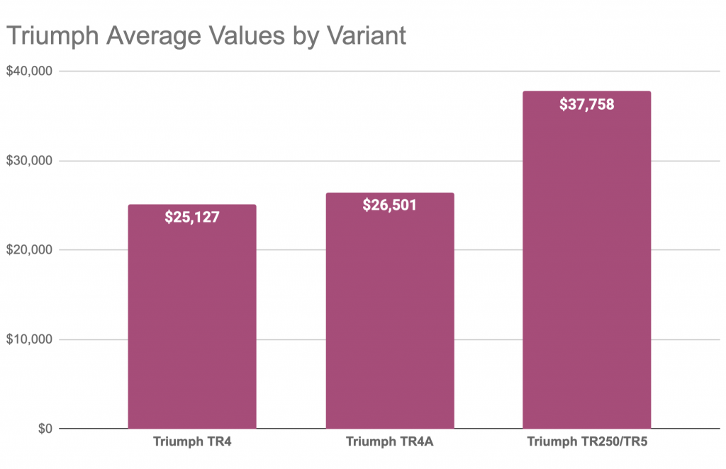 The TR250 and TR5 generally command much higher prices than the IRS or base variant TR4s. While the overall horsepower and performance difference is minimal (at least in the United States where the carburetted 6-cylinder was stifled), the 6-pot cars have a mystique and style that is more sporting.