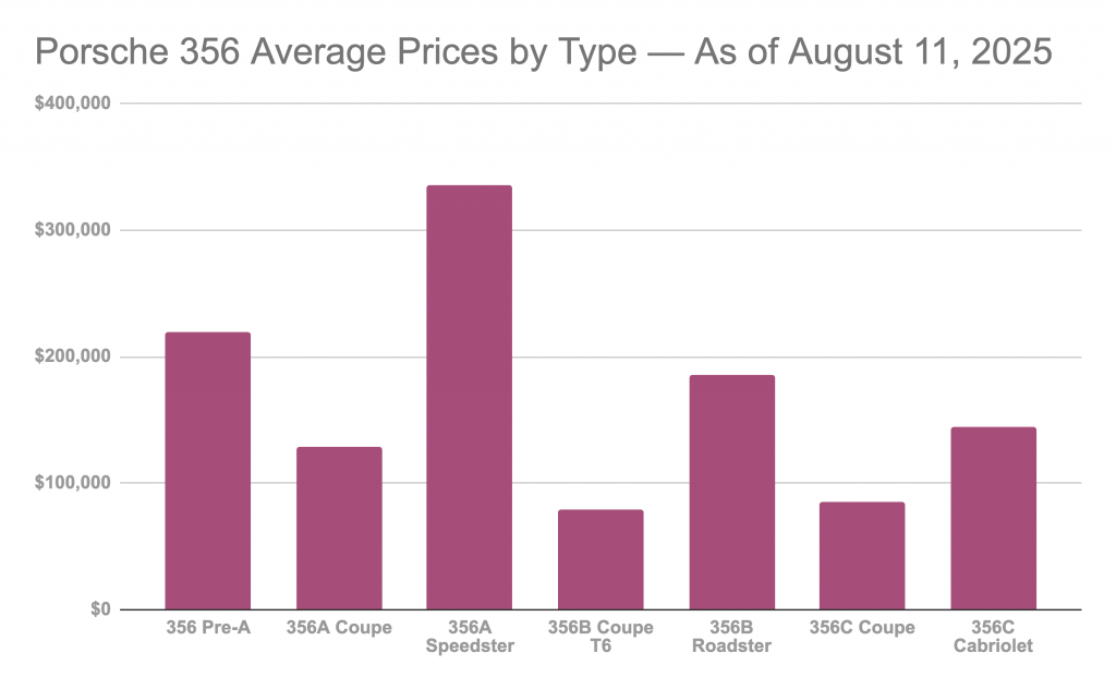 The chart above shows the current average price across each variant of 356 listed above (excluding the “special” cars, which have their own indexes). This is provided purely for comparison against the house estimates. It’s almost guaranteed that some — if not many — of the cars offered this year in Monterey are above “average” and some below.